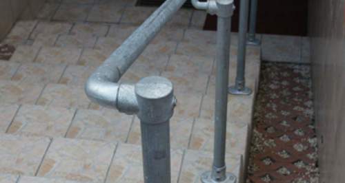 Poręcz ułatwiająca bezpieczne zejście po schodach osobie starszej w czasie opadów śniegu lub przymrozków